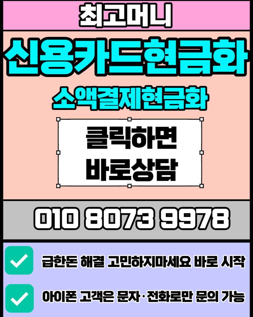 신용카드현금화 24시간상담을 통해 복잡한 절차 없이 자금난을 해소할 수 있도록 도와드립니다. 010-8073-9978 최고머니는 신용카드현금화 업계의 선두주자로서 정직하게 신용카드현금화를 진행해 드립니다. 또한 카드현금화 시 발생할 수 있는 불안 요소를 완벽히 차단하여 안전한 카드현금화가 이뤄지며, 상담 후 빠른 입금으로 카드현금화가 마무리됩니다. 소액결제현금화가 필요하신 경우에도 친절하게 소액결제현금화 절차를 안내해 드리니, 믿을 수 있는 소액결제현금화 상담을 받아보시길 바랍니다.