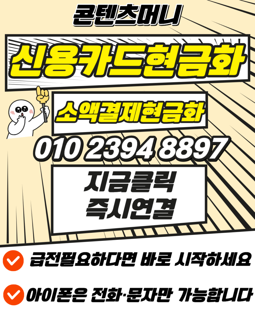 신용카드현금화 24시간상담을 통해 복잡한 절차 없이 자금난을 해소할 수 있도록 도와드립니다. 010-2394-8897 콘텐츠머니는 신용카드현금화 업계의 선두주자로서 정직하게 신용카드현금화를 진행해 드립니다. 또한 카드현금화 시 발생할 수 있는 불안 요소를 완벽히 차단하여 안전한 카드현금화가 이뤄지며, 상담 후 빠른 입금으로 카드현금화가 마무리됩니다. 소액결제현금화가 필요하신 경우에도 친절하게 소액결제현금화 절차를 안내해 드리니, 믿을 수 있는 소액결제현금화 상담을 받아보시길 바랍니다.