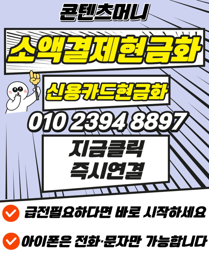 신용카드현금화 정식업체를 통해 사고 걱정 없이 자금을 마련하고 싶다면 콘텐츠머니가 정답입니다. 010-2394-8897로 문의 주시면 24시간 상담을 통해 신용카드현금화의 모든 과정을 상세히 설명해 드리며 신속한 신용카드현금화 처리를 도와드립니다. 이어지는 카드현금화 상담에서도 정직한 수수료를 약속하며, 확실한 카드현금화 입금으로 카드현금화 만족도를 보장합니다. 소액결제현금화가 급하신 분들도 기다림 없는 소액결제현금화 상담이 가능하니, 지금 바로 콘텐츠머니에서 안전한 소액결제현금화를 진행해 보시길 바랍니다.