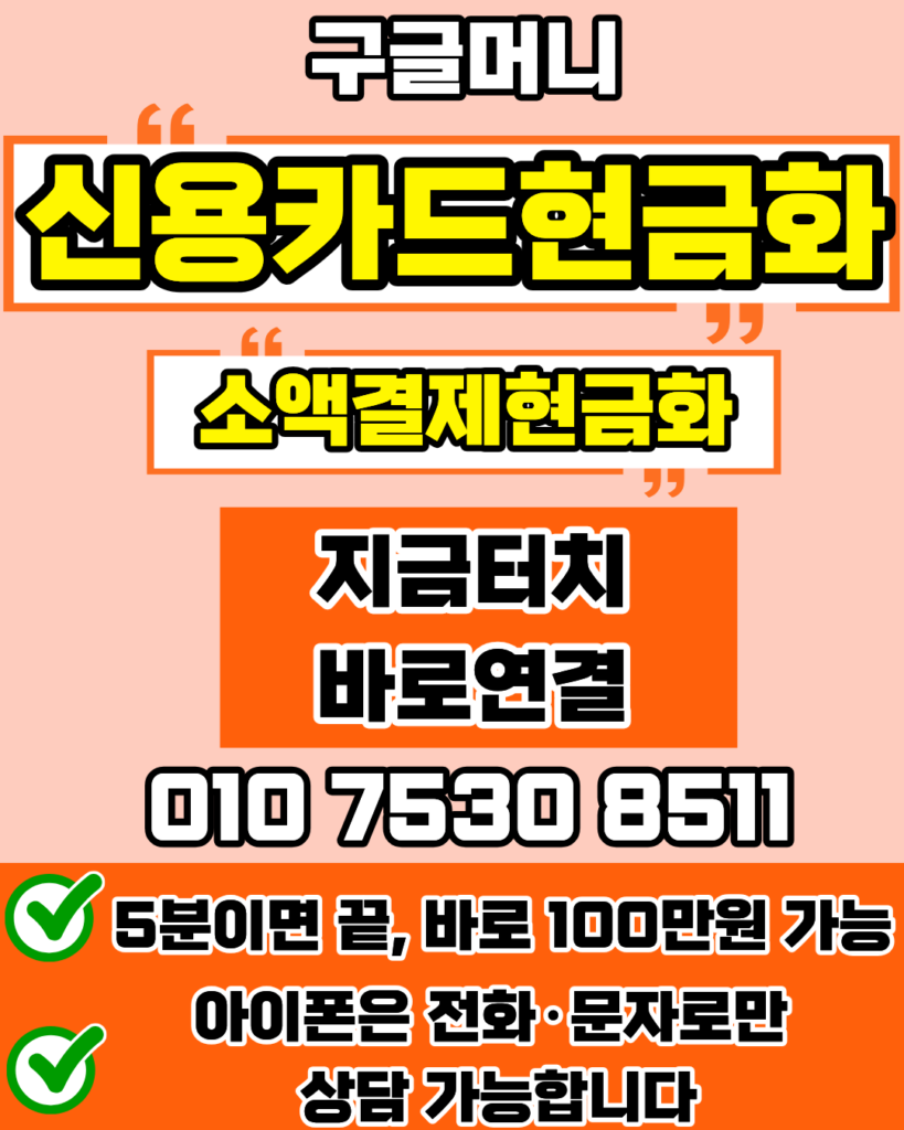 신용카드현금화 24시간상담을 통해 복잡한 절차 없이 당일 자금을 마련하실 수 있습니다. 신용카드현금화 전문 010-8048-8218 구글머니는 정직한 신용카드현금화 가이드를 제공하며, 신용카드현금화 완료 후 즉시 송금해 드립니다. 아울러 카드현금화 시 발생할 수 있는 보안 문제도 완벽히 차단하여 안전한 카드현금화가 이뤄지며, 카드현금화 상담 후 바로 카드현금화 입금을 받으실 수 있습니다. 만약 소액결제현금화 상담을 원하신다면 소액결제현금화 절차부터 소액결제현금화 한도까지 친절하게 안내해 드립니다.