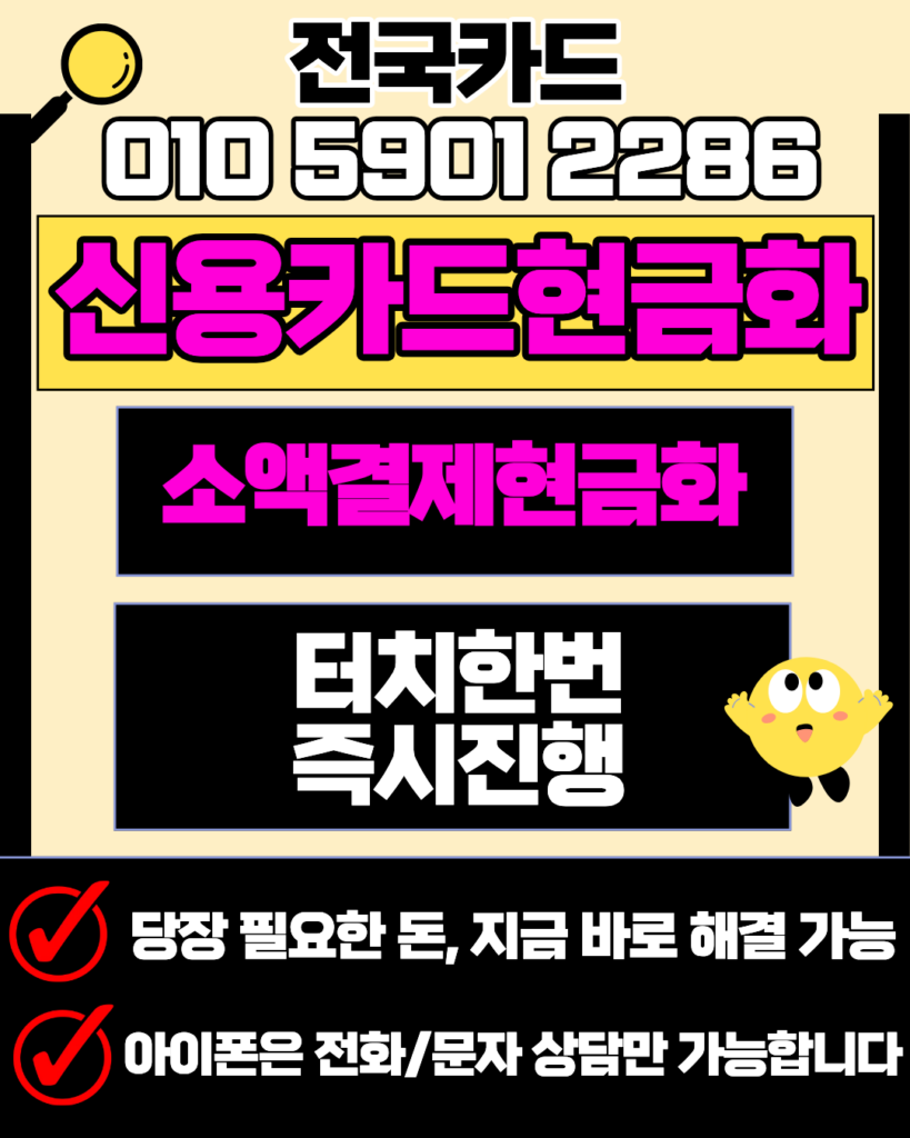 카드현금화 빠른입금 처리를 원하신다면 정식업체인 전국카드와 상담하시는 것이 가장 현명합니다. 010-5901-2286으로 연결하시면 24시간 상담원이 상시 대기하여 고객님의 카드현금화를 즉시 도와드립니다. 뿐만 아니라 신용카드현금화 상담도 활발히 진행 중이며, 합리적인 수수료의 신용카드현금화 서비스를 통해 만족도를 높여 드립니다. 본인 인증만으로 간편하게 신용카드현금화가 가능하며, 확실한 입금 처리를 약속드립니다.