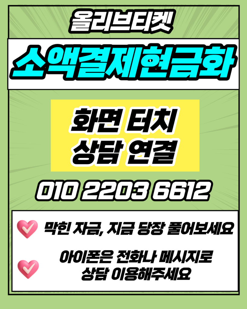 소액결제현금화 절차가 복잡할 것 같아 고민이신가요? 올리브티켓(010-2203-6612) 전문 상담원이 소액결제현금화의 모든 과정을 쉽고 빠르게 설명해 드립니다. 넥스트페이의 간편한 결제 인터페이스만큼이나 편리한 소액결제현금화 정산 시스템을 제공하며, 스마트폰만 있다면 누구나 소액결제현금화 혜택을 누릴 수 있습니다. 지금 바로 소액결제현금화 가능 여부를 1:1로 확인해 보세요.