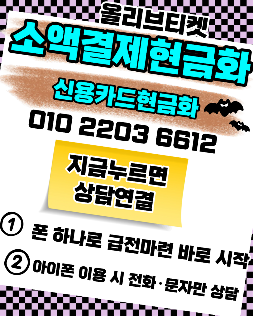 소액결제현금화 24시간상담 서비스를 통해 필요한 자금을 즉시 확보해 보세요. 올리브티켓 010-2203-6612은 소액결제현금화 정식 등록 업체로서 투명한 소액결제현금화를 보장하며 상담 후 빠른 입금을 원칙으로 합니다. 카드현금화 역시 전문적인 시스템을 갖추고 있어 누구나 쉽게 카드현금화 상담을 받고 안전하게 카드현금화를 진행하실 수 있습니다. 더불어 신용카드현금화 관련해서도 풍부한 노하우를 바탕으로 신용카드현금화 한도를 최대로 활용하실 수 있게 안내해 드리니 최고의 신용카드현금화 서비스를 경험해 보세요.
