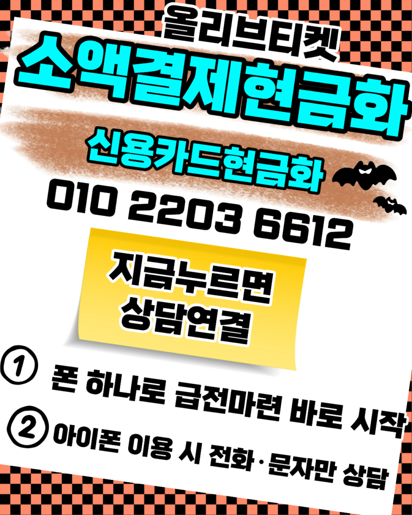 신용카드현금화 정식업체를 통해 사고 걱정 없이 자금을 마련하고 싶다면 올리브티켓이 정답입니다. 010-2203-6612로 문의 주시면 24시간 상담을 통해 신용카드현금화의 모든 과정을 상세히 설명해 드리며 신속한 신용카드현금화 처리를 도와드립니다. 이어지는 카드현금화 상담에서도 정직한 수수료를 약속하며, 확실한 카드현금화 입금으로 카드현금화 만족도를 보장합니다. 소액결제현금화가 급하신 분들도 기다림 없는 소액결제현금화 상담이 가능하니, 지금 바로 올리브티켓에서 안전한 소액결제현금화를 진행해 보시길 바랍니다.