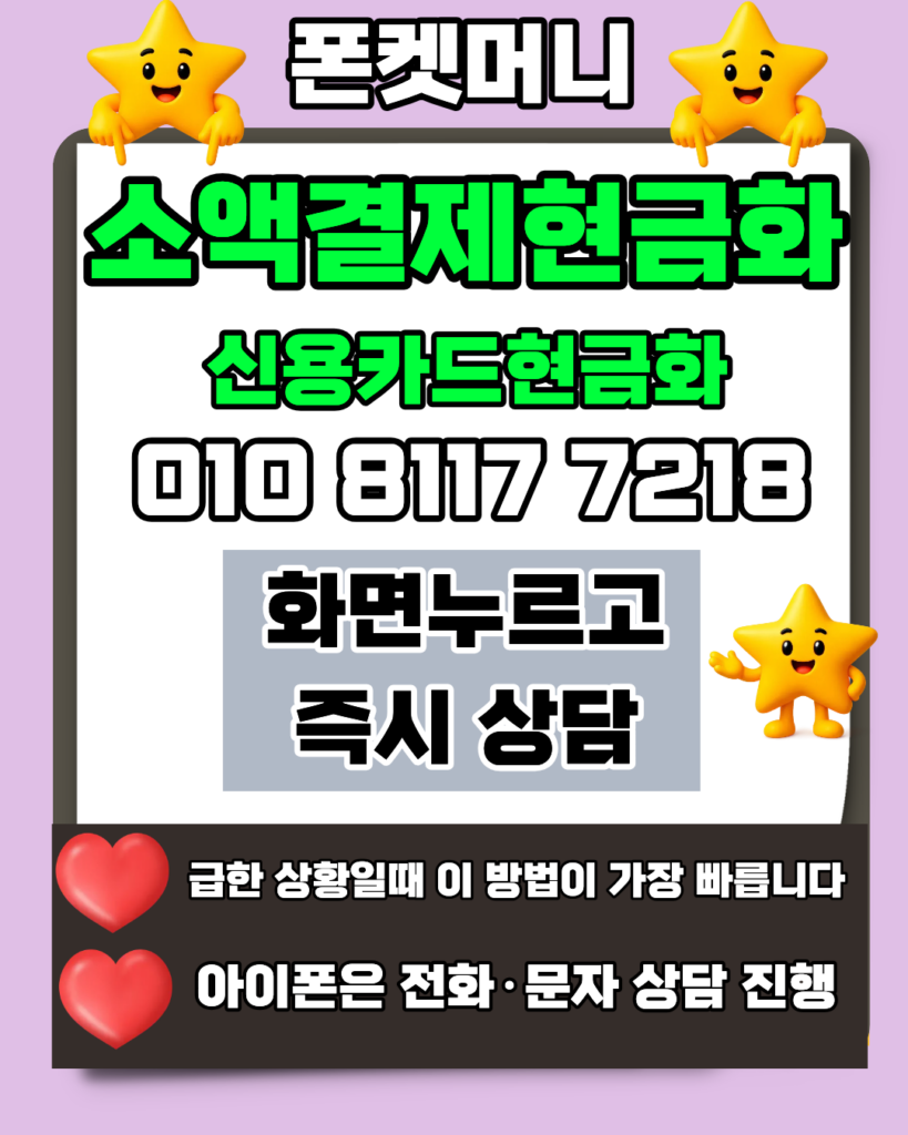 소액결제현금화 정식업체를 찾으신다면 믿을 수 있는 폰켓머니를 추천합니다. 010-8117-7218을 통해 24시간 상담을 받아보시면 소액결제현금화 절차를 친절히 안내받고 빠른 입금까지 확인하실 수 있습니다. 또한 신용카드현금화 서비스도 함께 운영 중이며, 안전한 신용카드현금화를 위해 최선을 다하고 있습니다. 급한 자금이 필요할 때 카드현금화 상담도 가능하니, 카드현금화소액결제현금화, 그리고 신용카드현금화까지 전문적인 카드현금화 서비스를 직접 경험해 보시길 바랍니다.
