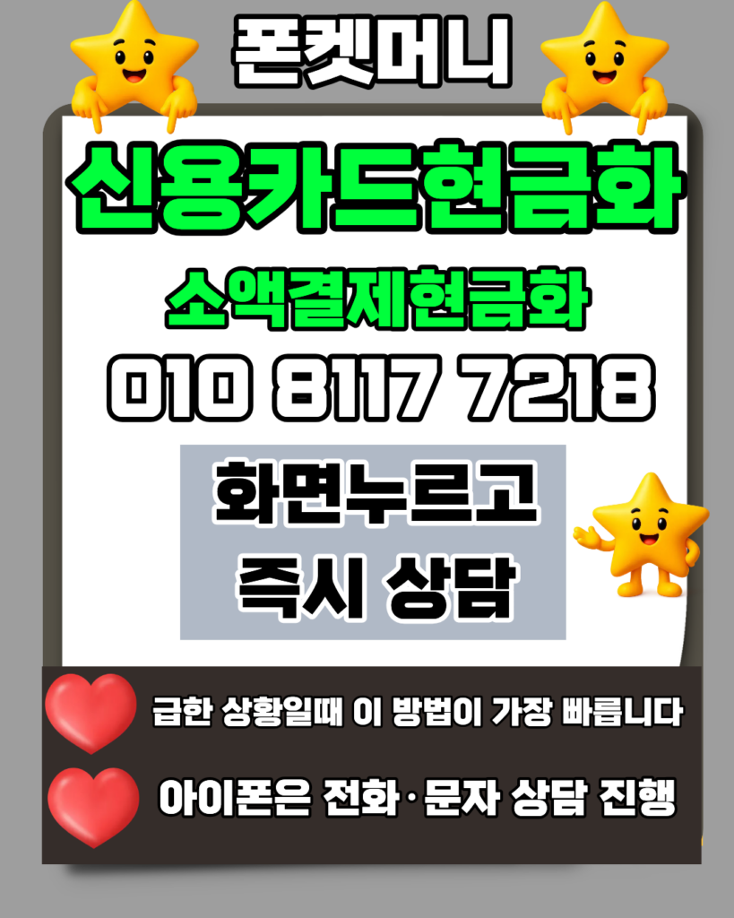 카드현금화 24시간상담이 가능한 폰켓머니는 언제나 고객님의 편의를 최우선으로 생각합니다. 010-8117-7218로 전화 주시면 카드현금화 전문가가 대기 시간 없이 즉시 빠른 입금을 도와드립니다. 최근 수요가 많은 소액결제현금화 역시 정식업체로서 투명하게 운영 중이며, 소액결제현금화 사기 피해 걱정 없는 안전한 소액결제현금화 환경을 약속합니다. 신용카드현금화가 필요하신 분들도 신용카드현금화 한도 내에서 최적의 신용카드현금화 상담을 받으실 수 있으니 카드현금화와 함께 문의하세요.