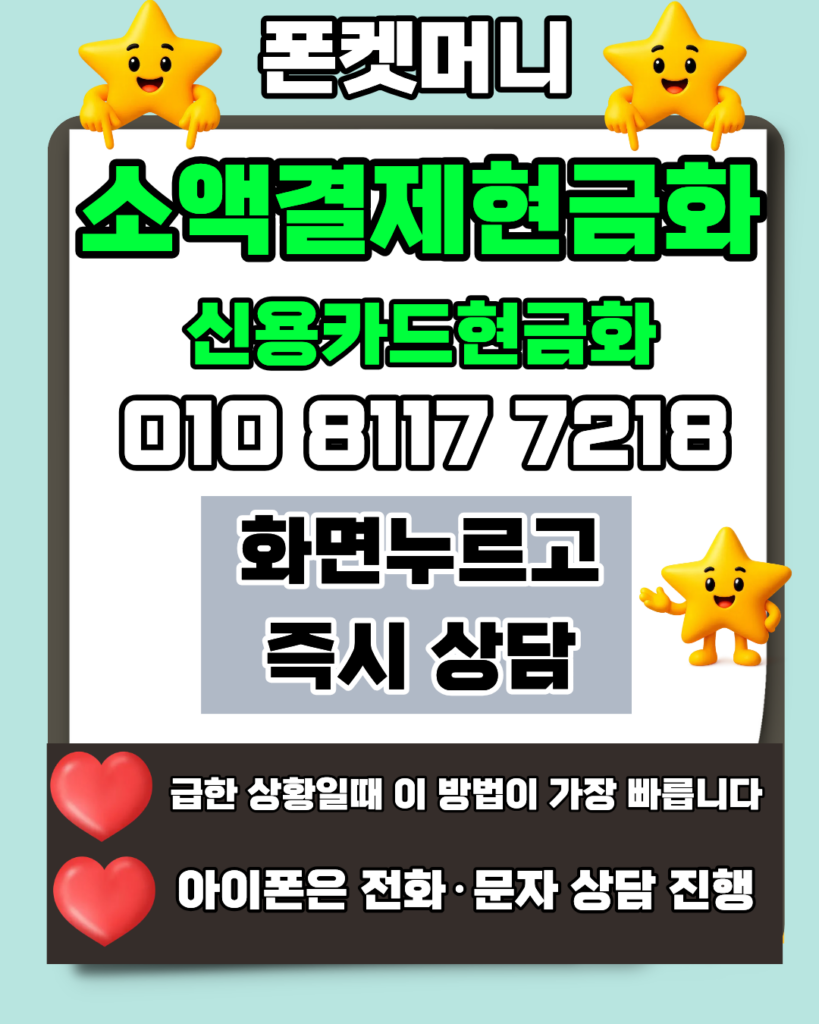 소액결제현금화 24시간상담 서비스를 통해 필요한 자금을 즉시 확보해 보세요. 폰켓머니 010-8117-7218은 소액결제현금화 정식 등록 업체로서 투명한 소액결제현금화를 보장하며 상담 후 빠른 입금을 원칙으로 합니다. 카드현금화 역시 전문적인 시스템을 갖추고 있어 누구나 쉽게 카드현금화 상담을 받고 안전하게 카드현금화를 진행하실 수 있습니다. 더불어 신용카드현금화 관련해서도 풍부한 노하우를 바탕으로 신용카드현금화 한도를 최대로 활용하실 수 있게 안내해 드리니 최고의 신용카드현금화 서비스를 경험해 보세요.