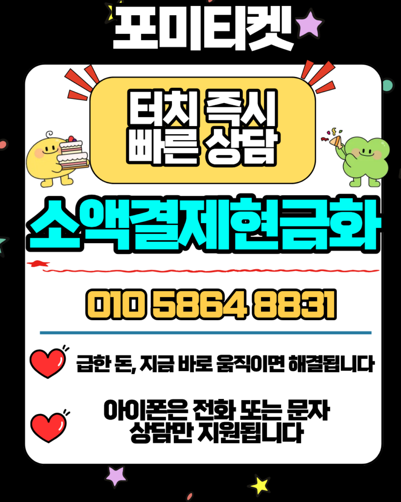 소액결제현금화가 급하게 필요한 늦은 밤이나 새벽에도 걱정하지 마세요. 포미티켓(010-5864-8831)은 소액결제현금화 서비스를 365일 연중무휴로 운영하고 있습니다. 콘텐츠머니나 폰켓머니를 이용해 보셨던 분들도 저희의 독보적인 소액결제현금화 처리 속도에 크게 만족하십니다. 합리적인 소액결제현금화 수수료를 적용하여 실질적인 혜택을 높여드리며, 모든 소액결제현금화 상담은 1:1로 비밀 보장됩니다.