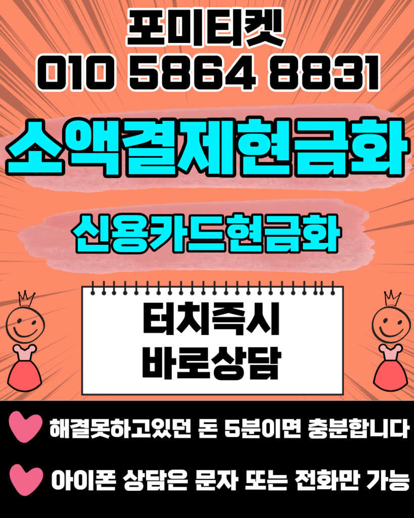 소액결제현금화 정식업체를 찾으신다면 믿을 수 있는 포미티켓을 추천합니다. 010-5864-8831을 통해 24시간 상담을 받아보시면 소액결제현금화 절차를 친절히 안내받고 빠른 입금까지 확인하실 수 있습니다. 또한 신용카드현금화 서비스도 함께 운영 중이며, 안전한 신용카드현금화를 위해 최선을 다하고 있습니다. 급한 자금이 필요할 때 카드현금화 상담도 가능하니, 카드현금화와 소액결제현금화, 그리고 신용카드현금화까지 전문적인 카드현금화 서비스를 직접 경험해 보시길 바랍니다.