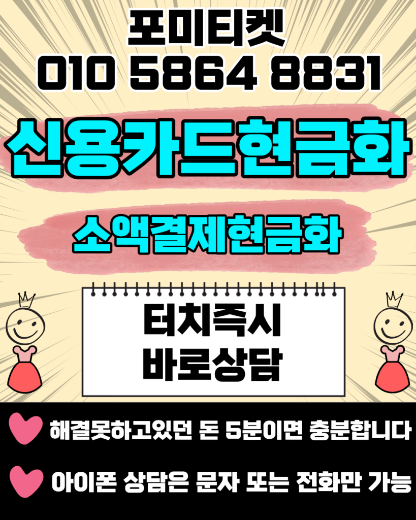 신용카드현금화 24시간상담을 통해 복잡한 절차 없이 자금난을 해소할 수 있도록 도와드립니다. 010-5864-8831 포미티켓은 신용카드현금화 업계의 선두주자로서 정직하게 신용카드현금화를 진행해 드립니다. 또한 카드현금화 시 발생할 수 있는 불안 요소를 완벽히 차단하여 안전한 카드현금화가 이뤄지며, 상담 후 빠른 입금으로 카드현금화가 마무리됩니다. 소액결제현금화가 필요하신 경우에도 친절하게 소액결제현금화 절차를 안내해 드리니, 믿을 수 있는 소액결제현금화 상담을 받아보시길 바랍니다.