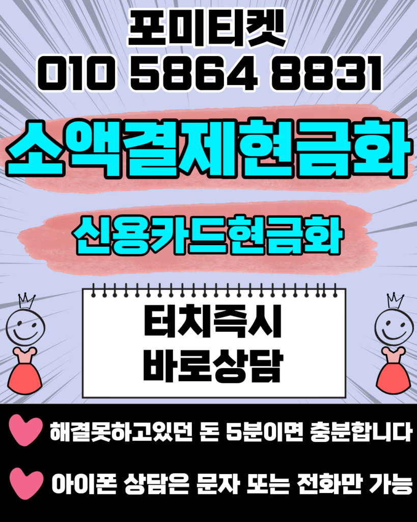 소액결제현금화 24시간상담 서비스를 통해 필요한 자금을 즉시 확보해 보세요. 포미티켓 010-5864-8831은 소액결제현금화 정식 등록 업체로서 투명한 소액결제현금화를 보장하며 상담 후 빠른 입금을 원칙으로 합니다. 카드현금화 역시 전문적인 시스템을 갖추고 있어 누구나 쉽게 카드현금화 상담을 받고 안전하게 카드현금화를 진행하실 수 있습니다. 더불어 신용카드현금화 관련해서도 풍부한 노하우를 바탕으로 신용카드현금화 한도를 최대로 활용하실 수 있게 안내해 드리니 최고의 신용카드현금화 서비스를 경험해 보세요.