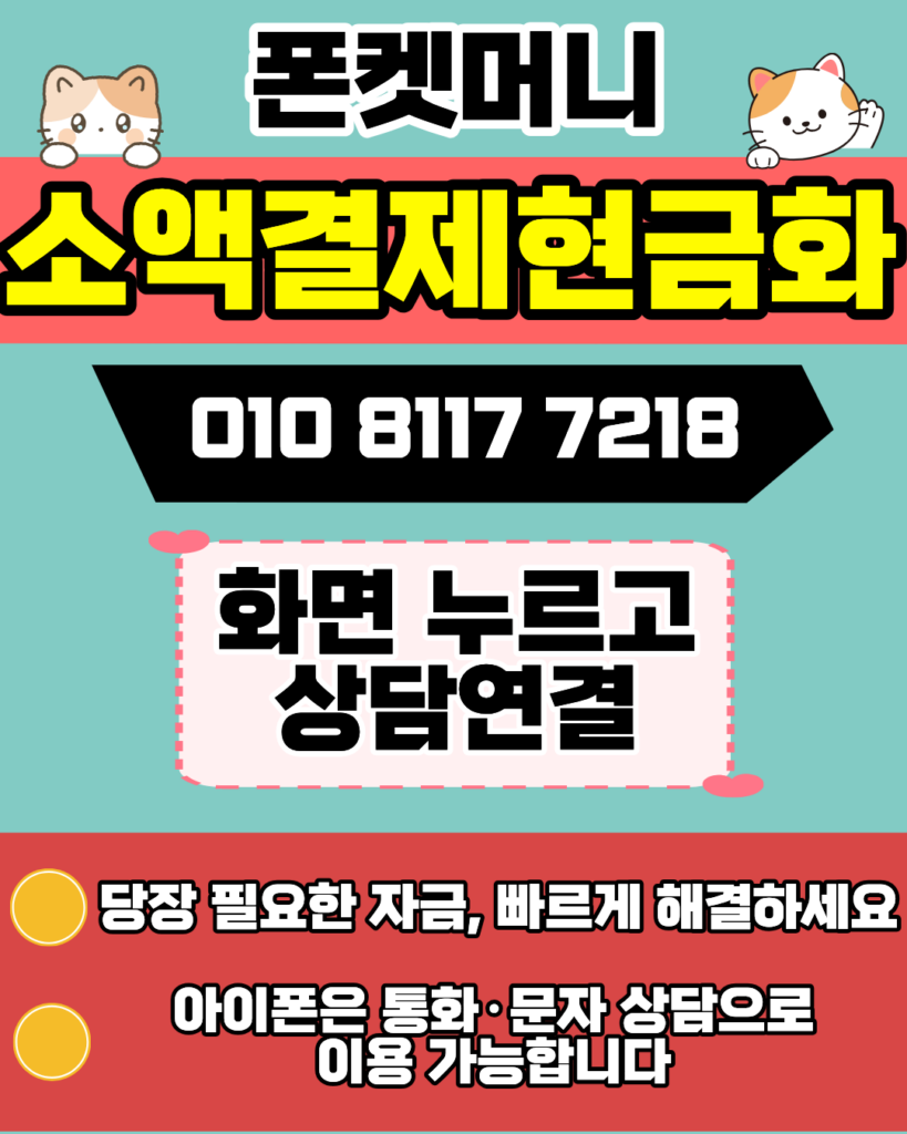 소액결제현금화 절차가 복잡할 것 같아 고민이신가요? 폰켓머니(010-8117-7218) 전문 상담원이 소액결제현금화의 모든 과정을 쉽고 빠르게 설명해 드립니다. 넥스트페이의 간편한 결제 인터페이스만큼이나 편리한 소액결제현금화 정산 시스템을 제공하며, 스마트폰만 있다면 누구나 소액결제현금화 혜택을 누릴 수 있습니다. 지금 바로 소액결제현금화 가능 여부를 1:1로 확인해 보세요.