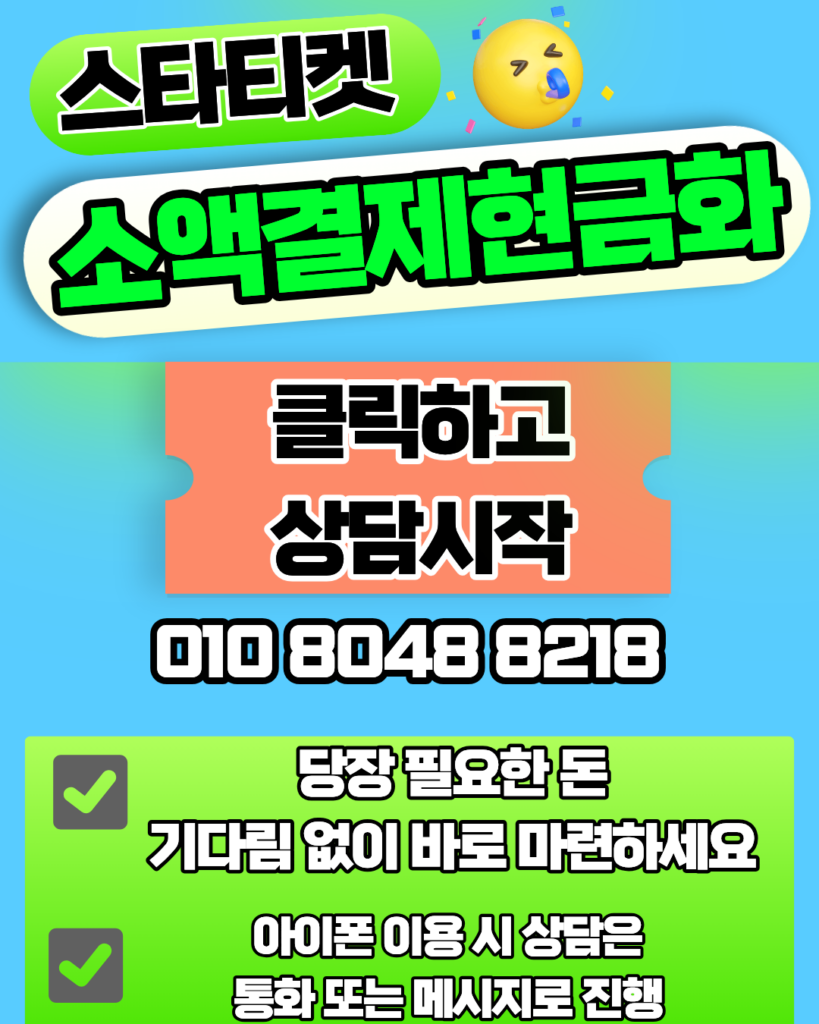 소액결제현금화 010-8048-8218 스타티켓 24시글쓴이 edwin0811 / 3월 29, 2026 소액결제현금화 010-8048-8218 스타티켓 즉시입금 소액결제현금화 밤낮 없는 연중무휴 고객지원 소액결제현금화가 급하게 필요한 늦은 밤이나 새벽에도 걱정하지 마세요. 스타티켓(010-8048-8218)은 소액결제현금화 서비스를 365일 운영하고 있습니다. 소액결제현금화 처리 속도에 대해 많은 고객님이 만족하고 계시며, 합리적인 소액결제현금화 수수료를 적용하여 혜택을 높여드립니다. 모든 상담은 1:1로 비밀 보장됩니다. 📱 소액결제현금화 실시간상담 클릭시 바로 연결됩니다. (아이폰은 문자전화 상담).