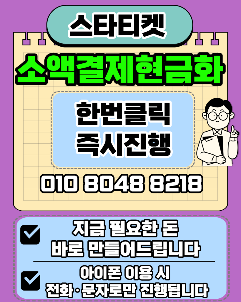 핵심 요약: 스타티켓(010-8048-8218)은 24시간 운영되는 정식 등록 업체로, 1분 이내 빠른 소액결제현금화 정산을 약속드립니다.