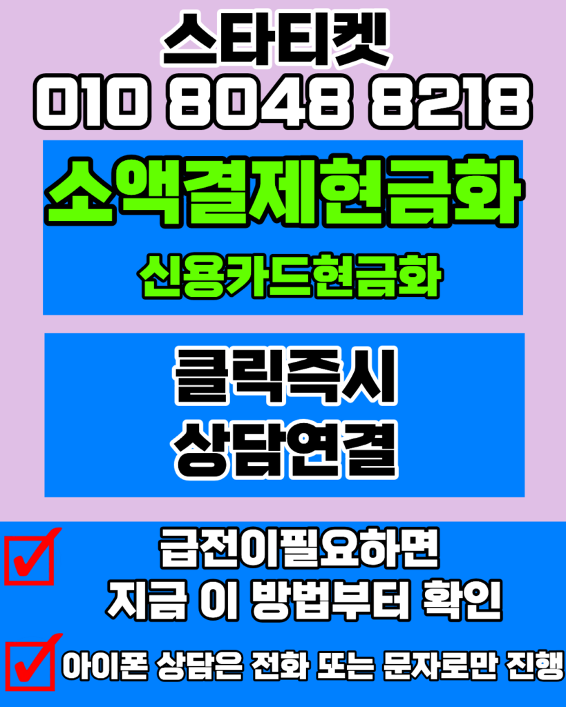 신용카드현금화 24시간 정식업체 스타티켓 010-2444-5390은 업계에서 가장 신속한 처리를 약속합니다. 신용카드현금화를 고민 중이시라면 신용카드현금화 한도 조회부터 상담받으시고 즉시 신용카드현금화 입금을 확인해 보시기 바랍니다. 추가로 카드현금화 서비스도 전문적으로 운영 중이며 카드현금화 수수료 걱정 없는 투명한 카드현금화 가이드를 제공해 드립니다. 급한 자금이 필요할 때 소액결제현금화 역시 든든한 해결책이 되며 소액결제현금화 신청 후 소액결제현금화 입금까지 단 5분이면 충분합니다.
