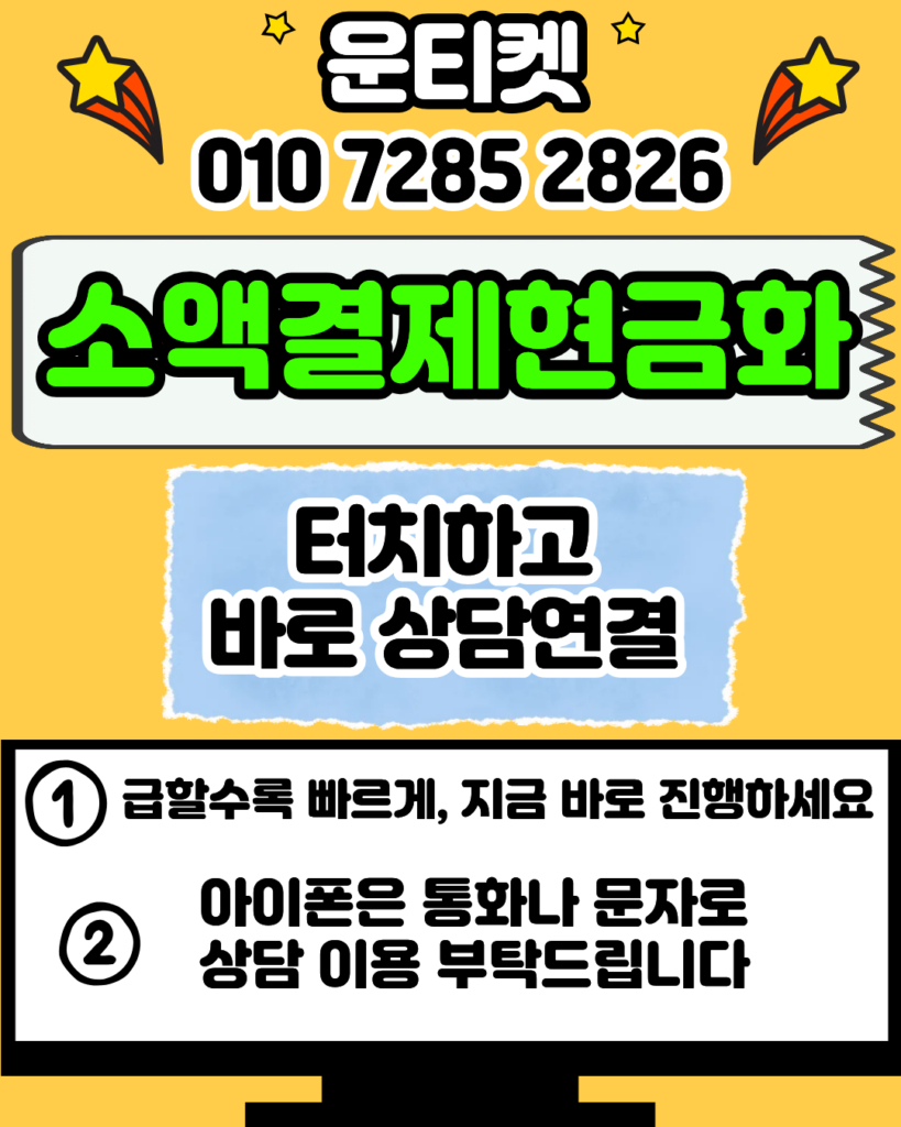 소액결제현금화 절차가 복잡할 것 같아 고민이신가요? 운티켓(010-7285-2826) 전문 상담원이 소액결제현금화의 모든 과정을 쉽고 빠르게 설명해 드립니다. 넥스트페이의 간편한 결제 인터페이스만큼이나 편리한 소액결제현금화 정산 시스템을 제공하며, 스마트폰만 있다면 누구나 소액결제현금화 혜택을 누릴 수 있습니다. 지금 바로 소액결제현금화 가능 여부를 1:1로 확인해 보세요.
