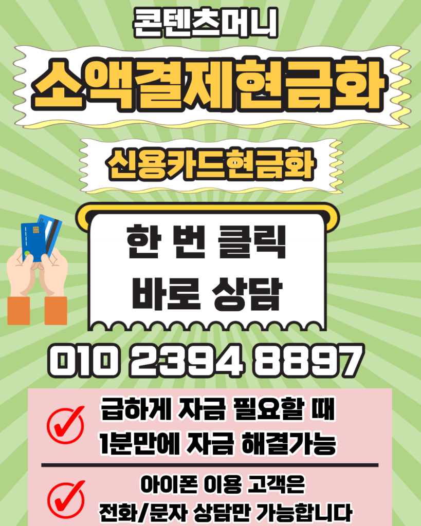 급하게 현금이 필요해서 신뢰할 수 있는 곳을 찾다가 소액결제현금화 전문 업체인 콘텐츠머니를 직접 이용해본 후기입니다. 처음 해보는 카드결제현금화라 걱정도 되고 모르는 부분도 많았는데, 010-2394-8897로 연락하니 상담원분이 친절하게 절차를 안내해주셔서 신용카드현금화까지 아주 수월하게 진행할 수 있었습니다.