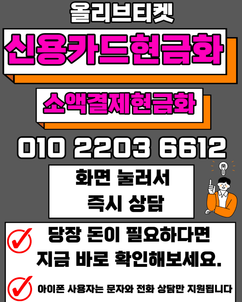 신용카드현금화 010-2203-6612 올리브티켓 소액결제현금화글쓴이 edwin0811 / 3월 19, 2026 신용카드현금화 상담 올리브티켓 010-2203-6612 신용카드현금화 및 소액결제현금화 카드결제현금화 즉시 입금 🌙 카드결제현금화 24시 연중무휴 1분상담