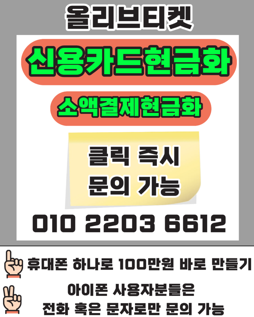 신용카드현금화를 쉽고 빠르게 진행하고 싶으신 분들께 올리브티켓을 강력 추천합니다. 올리브티켓의 신용카드현금화는 복잡한 서류 절차가 전혀 없으며, 24시간 상담을 통해 신용카드현금화 한도 확인 후 즉시 처리가 가능합니다. 빠르고 정확한 신용카드현금화 서비스를 약속드립니다.