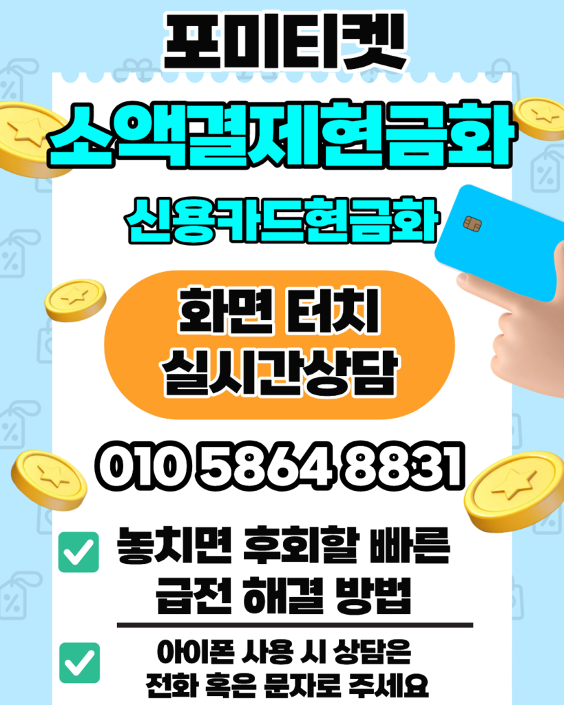 신용카드현금화를 쉽고 빠르게 진행하고 싶으신 분들께 포미티켓을 강력 추천합니다. 포미티켓의 신용카드현금화는 복잡한 서류 절차가 전혀 없으며, 24시간 상담을 통해 신용카드현금화 한도 확인 후 즉시 처리가 가능합니다. 빠르고 정확한 신용카드현금화 서비스를 약속드립니다.