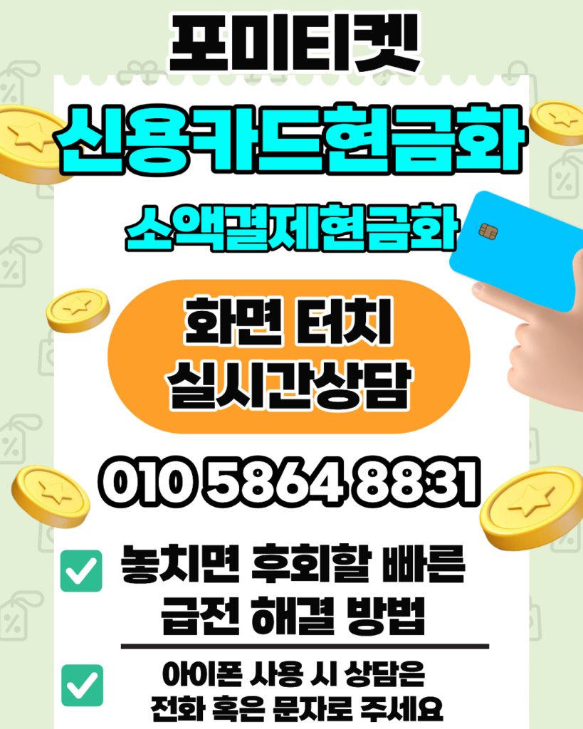 소액결제현금화 관련 사기 걱정 없는 정식 등록 업체를 찾으신다면 포미티켓이 정답입니다. 포미티켓은 소액결제현금화 과정에서 개인정보 보안을 최우선으로 하며, 투명한 수수료 체계로 소액결제현금화 서비스를 제공하고 있습니다. 단 1분이면 소액결제현금화 입금까지 완료되니 안심하고 이용하세요.